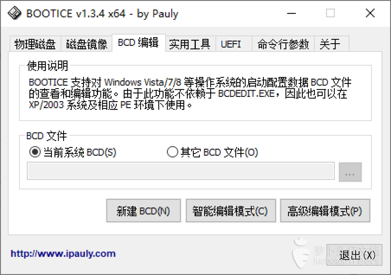1.打开bootice,顶部Tab菜单里选择BCD编辑,勾选当前系统BCD,选智能编辑模式;